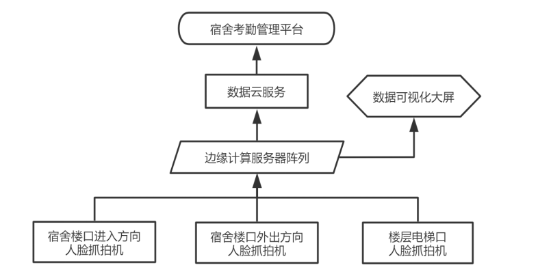 基于本校宿舍基本情況,結(jié)合學(xué)校運(yùn)營管理模式,將宿舍考勤系統(tǒng)軟硬件模塊按照如下架構(gòu)圖部署。綜合樓大門處出入兩方向根據(jù)樓道寬度分別安裝2-4個(gè)人臉識(shí)別抓拍機(jī),6-11樓層電梯口各安裝2-3個(gè)人臉識(shí)別抓拍機(jī),抓拍機(jī)視頻圖像數(shù)據(jù)通過網(wǎng)絡(luò)路由設(shè)備實(shí)時(shí)匯總*宿管邊緣計(jì)算服務(wù)器陣列,服務(wù)器將視頻流信息中解析出的人臉數(shù)據(jù)與校方學(xué)生人臉庫信息進(jìn)行實(shí)時(shí)N比N快速驗(yàn)證,獲得學(xué)生身份信息,將對(duì)比結(jié)果實(shí)時(shí)顯示在數(shù)據(jù)可視化大屏上。結(jié)合學(xué)校考勤及宿舍管理邏輯,將各維度報(bào)表分析推送*云服務(wù)器,校方管理人員可通過宿舍考勤管理平臺(tái)獲取數(shù)據(jù)分析結(jié)果。